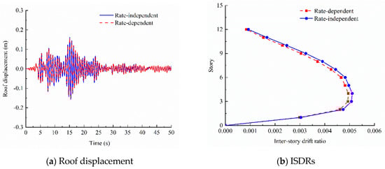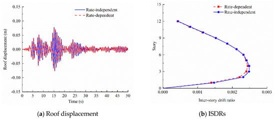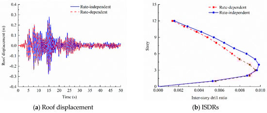 Comparison of the rate-dependent and rate-independent numerical results of roof displacement and an inter-story drift ratio (Taft PGA = 0.2 g).