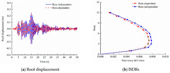 Comparison of the rate-dependent and rate-independent numerical results of roof displacement and ISDRs (Taft PGA = 0.8 g).