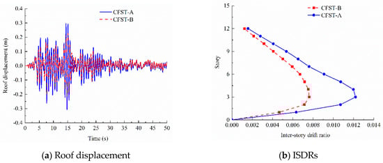 Figure 11 compares the roof displacement time history curve and ISDRs of CFST-A and CFST-B under Taft ground motion (PGA = 1.0 g). The maximum values of the roof displacement and ISDR of CFST-B are smaller than those of CFST-A. The ISDRs of CFST-B significantly decrease compared with those of CFST-A. Under the Taft ground motion, the maximum ISDR of CFST-B is 7.62 × 10−3, with a decrease of 37.5% compared with that of CFST-B.