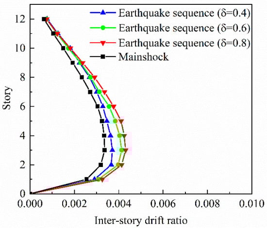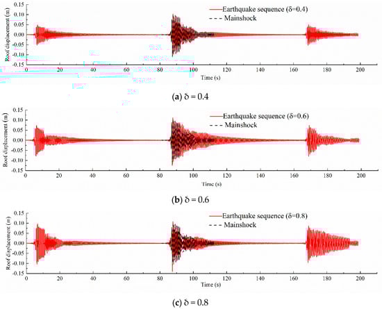 The numerical results show that, under the earthquake sequences with δ = 0.4, 0.6, and 0.8, the maximum roof displacement increases by approximately 1.46–31.56%, 5.14–66.18%, and 10.93–72.23%, respectively. The maximum ISDR increases by 2.99–51.47%, 7.32–67.01%, and 15.58–76.23%, respectively. Under the same earthquake sequence, with increasing δ, the maximum roof displacement and the maximum ISDR of the structure gradually increases. In summary, when the PGA of the selected ground motion is relatively small, the amplitudes of the foreshock and mainshock in the earthquake sequence are very small. After the foreshock, the structure is in an elastic state. After the mainshock, which has a slightly greater intensity than the foreshock, the structure is still in an elastic state. At this time, as the damaged structure experiences the aftershock, the risk of damage to structural members can greatly increase. When the PGA of the selected ground motion is relatively large, two situations may occur. In the first situation, δ is relatively small, and the amplitude of the foreshock is relatively small, while the magnitude of the mainshock is relatively large in the earthquake sequence. After the foreshock, the structure is still in an elastic state, but, after the mainshock, the structure enters a nonlinear state, which results in structural plastic damage. In the second situation, δ is relatively large, and the peak amplitudes of both the foreshock and the mainshock in the earthquake sequence are large. As a result, the structure has already undergone moderate or severe damage during the foreshock, which exhibits notable plastic characteristics and stiffness degradation. When subjected to the mainshock with a higher intensity, the structural cumulative damage increases significantly, and the stiffness further decreases. At this time, the damaged structure experiences a strong aftershock, and the risk of collapse to the structure greatly increases.