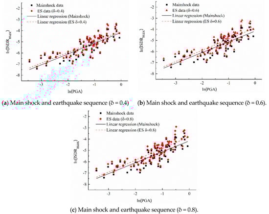 The PSDM of CFST-B is calculated using the above-described cloud method. Figure 14 shows the PSDM of the structure subjected to a single mainshock and different earthquake sequences with δ = 0.4, 0.6, and 0.8. The details of regression results for each case are shown in Table 5. As shown in Figure 14, the seismic demand parameter (ISDRmax) and the ground motion intensity parameter (PGA) follow a logarithmic linear relationship well, with coefficients of determination R2 of 0.76618, 0.75449, 0.77191, and 0.76804, respectively. All R2 values obtained based on the results of the nonlinear time history analysis of CFST-B are greater than 0.75, which indicates that the PSDM is highly credible in describing the probabilistic characteristics of the seismic demand of the structure. This lays a foundation for the subsequent seismic fragility analysis based on the PSDM.