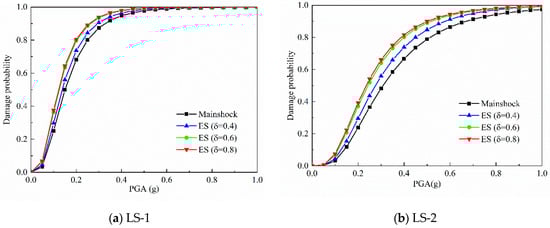 The PGA corresponding to an exceedance probability of 50% in the seismic fragility curve is defined as the median PGA of the seismic fragility curve. The median PGAs corresponding to the structure exceeding LS-1 under earthquake sequences with δ = 0.4, 0.6, and 0.8 decrease by 5%, 7%, and 12%, respectively, when compared with those under the mainshock. The median PGAs corresponding to the structure exceeding LS-2 under earthquake sequences with δ = 0.4, 0.6, and 0.8 decrease by 9%, 11%, and 16%, respectively, when compared with those under the mainshock. The median PGAs corresponding to the structure exceeding LS-3 under earthquake sequences with δ = 0.4, 0.6, and 0.8 decrease by 14%, 16%, and 19%, respectively, when compared with those under the mainshock. The median PGAs corresponding to the structure exceeding LS-4 under earthquake sequences with δ = 0.4, 0.6, and 0.8 decrease by 15%, 25%, and 29%, respectively, when compared with those under the mainshock. These results show that the PGA corresponding to the structure exceeding each limit state under the earthquake sequence decreases when compared with that under the mainshock. Therefore, the structure is more likely to be damaged under an earthquake sequence than under a single mainshock when the other conditions remain the same. Therefore, earthquake sequences should be considered in the seismic design of structures.