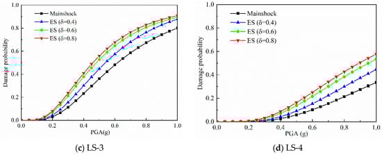 Figure 15 shows the fragility curves for the damage limit states LS-1, LS-2, LS-3, and LS-4. It can be observed that all seismic fragility curves under the earthquake sequence are located above those under the single mainshock, which indicates that all damage probabilities of different damage limit states for the structures under earthquake sequences increased. An increasing δ, which means higher impact of the earthquake sequence on the cumulative structural damage, leads to a higher damage probability.