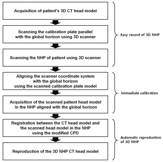 In this study, we developed a new method for easily recording and automatically reproducing 3D NHP models based on immediate calibration using a portable 3D scanner and a calibration plate. The calibration for aligning the scanner coordinate system with the global horizon could be performed easily by an inexperienced user, and the 3D NHP model could be reproduced automatically using the modified CPD algorithm. Further, the accuracy of the developed method was high enough to be acceptable for clinical use. Therefore, we expect the developed method can be used for diagnosing and treating orthognathic patients with facial asymmetry more accurately and conveniently than the currently availably methods. In future studies, we hope that this method is able to work across genders, race, ethnicity, etc. with more patients, and to develop a method for the reproduction of the patient’s NHP involving eliminating the recording process using artificial intelligence.