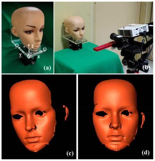 There have been several studies investigating the 3D NHP reproduction of CT head models. In a previous study, we used a pose from orthography and scaling with iterations (POSIT) algorithm to orient 3D CT head models to the NHP using 2D images of the patient’s face with spherical ceramic markers attached [9]. Although this method used a basic 2D digital camera, without the need for expensive equipment, and was able to preserve the patient’s natural lip position in the 3D CT head model, manual extraction of the marker positions on the 3D CT model and the 2D image was time consuming, and attaching the fiducial markers to the face caused discomfort in the patients. Other studies have used 3D scanned head images obtained using a stereophotographic scanner system [13,14]. The method allowed automatic rotation of the 3D CT model to the 3D scanned patient model recorded in the NHP using surface registration [14]. However, the system was bulky and required a large space for recording the patient’s NHP, and special devices, such as a reference board and a laser lever system, were necessary for calibrating the scanner coordinate system to a physical reference. Moreover, the calibration procedures required for using the devices were complex and time consuming for an inexperienced user.