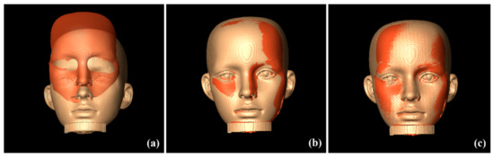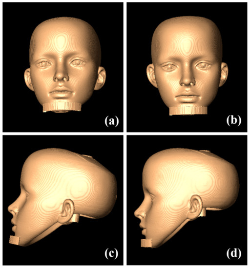 We registered the patient’s CT head model with their optically scanned head model in the NHP aligned with the global horizon using the surface registration method of a modified coherent point drift (CPD) algorithm [16,17]. The coarse registration between the CT model and the scanned NHP model was first performed using a principal component analysis (PCA) [16]. Then, fine registration was performed using the CPD algorithm to obtain a more precise match. The CPD considered the alignment of the two models as a probability density estimation, where one model represented the Gaussian mixture model (GMM) centroids, and the other represented the target of movements [17]. As the CPD uses a probability density estimation, such as a Gaussian mixture model (GMM), this probabilistic method performs better than the general iterative closest point (ICP) algorithm, which is commonly used for surface registration, especially in the presence of noise and outliers [17]. In this study, we automatically reproduced the 3D NHP CT model by applying the resulting transformation from the registrations to the patient’s CT head model without manually selecting landmarks on the CT model for registration. Although the 3D CT head model was rotated to the NHP model semi-automatically by applying a pose from orthography and scaling with iterations (POSIT) algorithm [9], the method required time and labor to accurately extract the positions of the landmarks in the 3D CT head model and 2D image. Moreover, in the present study, there will be no intra- or inter-observer variation in accuracy of the NHP reproduction because NHP reproduction is performed automatically using the modified CPD registration. However, the positive and negative definite deviations for the patient’s face were higher than those for the mannequin phantom when using the modified CPD registration. The registration error increased as human skin was more deformable. Nonetheless, the registration errors for most of the patient’s face surface were lower than one millimeter.