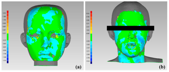 A mannequin phantom was used to evaluate the accuracy of the developed method for recording and reproducing the NHP. The phantom CT data were obtained at an arbitrary position in the CT coordinate system. The calibration plate and the phantom were optically scanned sequentially using a 3D scanner. At that time, the phantom was set to be parallel to the global horizon, and this posture was defined as the NHP of the phantom. The coordinate system of the 3D scanned model was oriented to the global coordinate system immediately by applying the orientation information from the calibration plate. As a result, the scanned phantom model was also aligned with the global horizon by applying the same orientation as in the calibration (Figure 3c,d). Then, we automatically determined the transformation of the phantom CT model into the scanned NHP model by registration between the CT model and the NHP model using the modified CPD method (Figure 4). The deviation errors associated with the registration were expressed as color mapping (Figure 5). The mean deviation error was 0.26 ± 0.25 mm, and the positive and negative definite deviations were lower than one millimeter for most of the patients (Figure 5). We reproduced the phantom CT model in the NHP by applying the rotation from the registration to the CT model (Figure 6). For five patients with severe and mild facial asymmetries, we recorded the NHP of each patient once, and reproduced the patients’ CT head model in the NHP using the same method (Figure 5 and Figure 7).