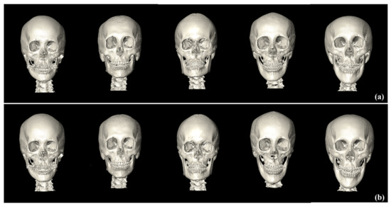The natural head position (NHP) is the ideal reference position for assessing the facial morphology of patients with asymmetry [2,3]. Conventionally, many methods for recording and reproducing the NHP have concentrated on two-dimensional (2D) implementations using lateral cephalograms [4,5,7,18,19]. Recently, three-dimensional (3D) CT images have been widely used in the diagnosis and treatment of orthognathic patients [20,21,22,23,24,25,26]. However, the 3D CT head model does not represent the NHP, because the patient’s head is located at an arbitrary position in the coordinate system during CT scanning. Therefore, there exists a growing need to reproduce 3D CT head models in the NHP.