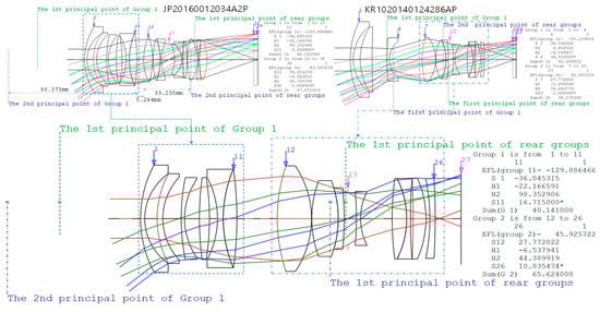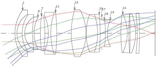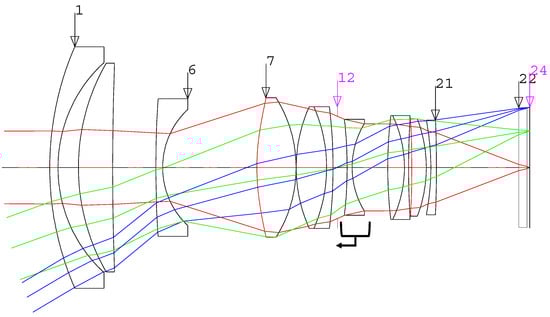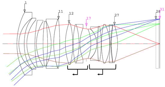 The design software used in this study was CODE V (Synopsis, Optical system design Inc., East Boothbay, ME, USA). Figure 2 illustrates the optical path for the optical system of Example 1 from the patent JP20160012034A2P. In Figure 2, beginning at the object side to the sixth surface, the object serves as a converter to rapidly change the angle of view, and the sixth surface to the twenty-seventh surface forms shape of a double-gauss type for the incoming rays. This optical system has optical specifications of F/# 1.4 and EFL of 24 mm, and the applied imaging sensor size satisfies 21.7 mm of full-frame. However, the AF system is a floating type optical system focusing on the third group from the 12th surface of the optical system to the 16th surface and the fourth and fifth groups from the 18th surface to the 27th surface. As it has a flange back distance for DSLR, it does not match the flange back distance for the CSC design.