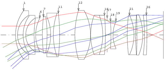 The optical path of the synthesized optical system is shown in Figure 4. The EFL of the synthesized optical system is 26.302 mm, which is the difference between the designed target of 24 mm and 2.3 mm at 5 degrees field of view. In addition, the BFL is 10.83 mm, which is shorter than the standard CSC flange back specification. Considering that this optical design is a very wide angle system intended for the CSC format, proper correction of the focal length and back focal length is essential and so this was adjusted by solving the simultaneous equations of Equation (2). Here, the lens surface selected to correct each day’s radiation must be capable of physical fabrication, where the curvature and thickness after correction must not be largely changed from the existing values. Additionally, as there is no real numeric solution in the quadratic equation to find the solution of the focal distance, various combinations of variables were applied, and then, R1, R4, and D11 variables were selected. R1 is the curvature of the first surface, R4 is the curvature of the fourth surface, and D11 is the lens thickness of the 11th surface. When the variables R1, R4, and D11 were selected and the BFL was corrected to 15 mm, the changed values of each variable were as illustrated in Table 2. At this point, if a second correction is performed to adjust the focal length to 24, it was confirmed that the parameters of R2, R3, and R25 variables changed as illustrated in Table 3. In this case, variable selection was chosen by examining the variable combinations as mentioned above.