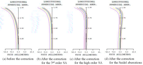 Moreover, as the aspherical surface becomes larger, the material and processing cost increase []. Therefore, the 18th surface was selected as the aspherical surface to correct spherical aberration considering both the correction effect and the processing cost. In this study, a method to reduce the total number of aberrations by adjusting the balance with higher order aberrations was used. Using Equation (9), the fourth-order aspheric coefficient A4 when the Seidel spherical aberration is zero was calculated as −1.982156e−5, and Figure 6b shows the order difference when it is applied to the 18th surface. In this case, by comparing with Figure 6a, which is the order difference before the correction, it can be confirmed that the longitudinal spherical aberration shifted in the positive direction. Additionally, as shown in Table 3 line (b), SAT and spot size decreased from 3.571648 to 2.343004 mm. Here, SAT is the sum of the third-order, fifth-order, and seventh-order spherical aberrations.