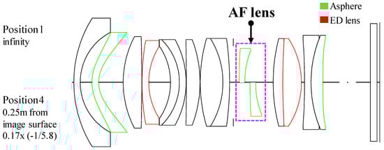 Three lenses, one 10th AF lens, one second lens, and one 14th lens, were used as the aspheric surfaces in the design. The total comprised of 14 lenses, including two extra low dispersion (ED) lenses. The aspherical surface of the AF lens was used for spherical aberration correction in the basic design process. Additionally, to correct residual aberrations such as coma aberration, astigmatism, and distortion aberration, the object side and the upper lens side was used. Figure 9 is a collection of graphs illustrating the species difference between the infinity and the principal shooting distance. The pitch angle difference is generally stable at infinity and the principal shooting distance, and the distortion aberration is −5%, which includes some barrel distortion but still meets the design goal.