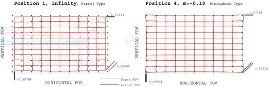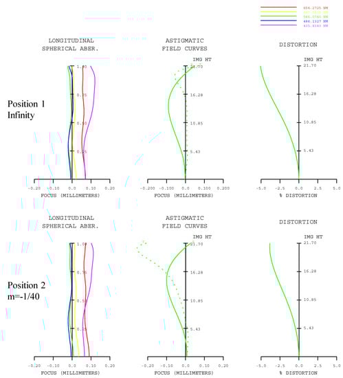 Figure 10 and Figure 11 illustrate the TV distortion and MTF graph of the final design. In infinity, the TV distortion has a Barrel type distortion of −1.40% and +1.57% at the furthest object distance, which has a pincushion type of distortion. The MTF satisfies 70% or more at 30 lp/mm with respect to the center of the screen, and more than 30% at the periphery up to the 0.85-field.