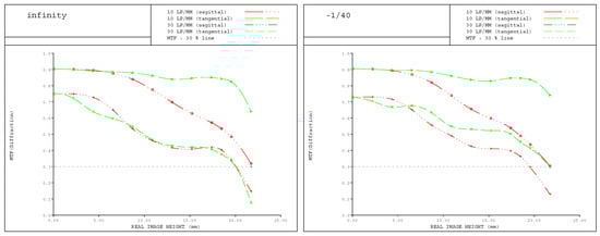 As shown in Figure 11, as the image height increases, the MTF gradually decreases. This is because aberrations such as coma and astigmatism increase as the image height increases, as shown in the astigmatic field curve in Figure 9. Most camera manufacturers disclose MTFs with 10lp/mm and 30 lp/mm spatial frequencies for camera optics [,]. Therefore, this paper also identified MTF based on the same criteria.