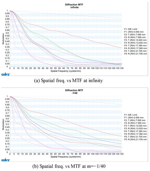Figure 12 shows the MTF as the spatial frequency changes. Figure 12a shows the object at infinity and Figure 12b shows the magnification of −1/40 times. The maximum spatial frequency in each graph is 135 lp/mm, which is the Nyquist frequency of the digital sensor with the largest pixel of the currently available camera body.