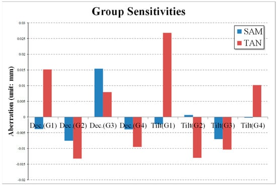 In Figure 13, SAM is spherical aberration, SAG is the sagittal component of field curvature, and TAN is the tangential component of field curvature. As illustrated in Figure 13, the tangential component of the field curvature changes considerably with respect to tilt, and the spherical aberration changes with respect to the decentering of the third group. Therefore, it is possible to correct the spherical aberration and field curvature caused by the assembly error of the designed optical system. It is also evident that the sagittal component of the field curvature does not change significantly due to the assembly error of the lens group. This can be explained by the third order aberration theory, because the sagittal component is generally about one third smaller than the tangential component [].