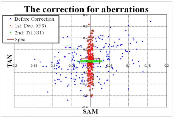 Manufacturing errors for the optical system can be classified as being rotationally symmetrical and asymmetrical with respect to the optical axis. Here, rotationally symmetrical errors include lens shape, thickness, and material refractive index, and rotational asymmetry errors include centering, seat tilt, clearance, group decenter, and group tilt []. These errors allow us to calculate spherical aberrations and field curvatures that affect resolution degradation. In this case, the aberration may be corrected by adjusting the decenter and tilt of the specific lens group in order to counteract the aberrations generated during the assembly of the optical system.