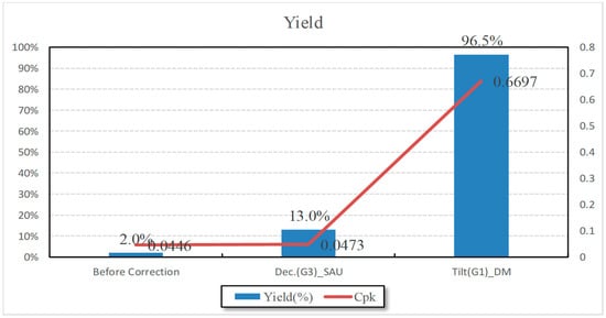 To estimate the actual failure rate from the results shown in Figure 12, we need to analyze the process capability index (Cpk). Cpk can be calculated by Equation (13) [].