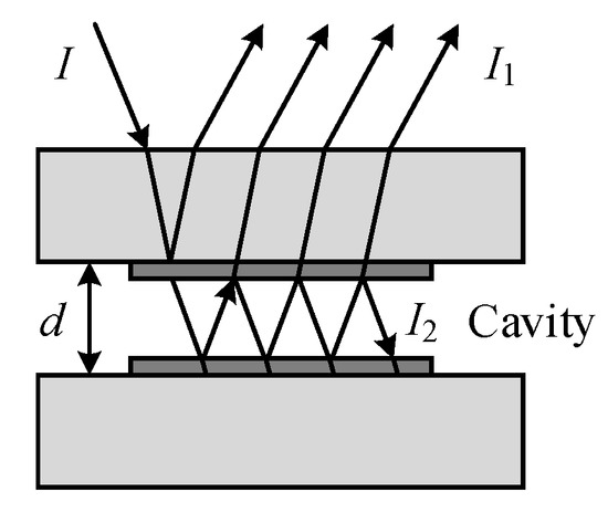 The interference device comprises two mutually parallel planes of high reflectivity, the distance between the two planes being d. As illustrated in Figure 1, when the incident light beam of the external broadband light source is traveling along the fiber core of the optical fiber, multiple reflections are transmitted between the two surfaces of the cavity to form an interference fringe and return to the optical fiber. Based on the theory of FPI, the light intensity of the interference signal is given by [22,29]