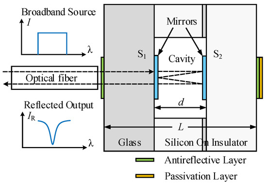 Figure 2 depicts the schematic diagram of configuration of the extrinsic fiber FP strain sensor in this paper, which is mainly developed through an FP optical interference cavity, fiber collimator support, and fiber collimator. The cavity is composed of two high reflectivity parallel planes that are made by MEMS microprocessing technologies. One plane, S1, is the high reflection film on the right face of the fixed glass, and the other plane, S2, is the left side of the bottom layer of silicon of the SOI (silicon-on-insulator wafers) strain beam. The strain beam is bonded on the fixed glass by the silicon–glass anode bonding. Then, an anti-reflection coating is deposited on the face of the fixed glass that is not bonded, and an anti-reflection layer and a passivation layer are deposited on the other surface of the SOI strain beam to reduce the reflected light and weaken the error signal. When the coherent beam is incident into the optical interference cavity along the collimated beam expanding fiber, the incident light beam is reflected multiple times between the S1 and S2 planes to form multiple-beam interference, and it returns to the collimated beam, expanding the fiber along the original path. The interference output signal is related to the length of the microcavity between the S1 and S2 planes.