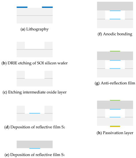 Manufacturing process of the extrinsic fiber Fabry–Perot probe. (a) Lithography. (b) Deep reactive ion etching (DRIE) etching of silicon-on-insulator (SOI) silicon wafer. (c) Etching intermediate oxide layer. (d) Deposition of reflective film S2. (e) Deposition of reflective film S1. (f) Anodic bonding. (g) Anti-reflection film. (h) Passivation layer.