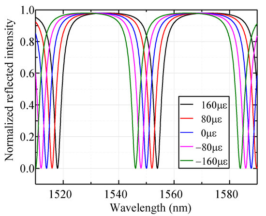 Under different positive and negative strain conditions, the simulated reflection spectrum of the EFFP sensor is shown in Figure 4.