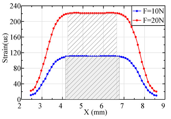 As shown in Figure 6, the finite element analysis results can be obtained as follows. (1) When the external load applied on the structure is 10 N, the sensor should located at the position of the structure between 4.173 mm and 6.873 mm in the X axial direction. (2) When the external load applied on the structure increases to 20 N, the axial coordinate range of the uniform strain field is 4.272–6.773 mm. The larger the load, the smaller the range of the uniform strain field.