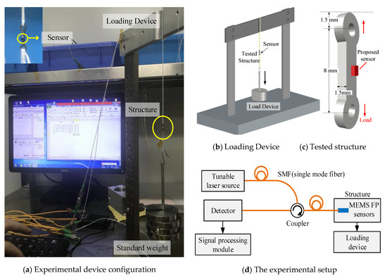 The diagram of the experimental system. The proposed sensor was attached by welding a layer to the small structure. The load was applied by the load device. (a) Experimental device configuration. (b) Loading device. (c) Tested structure. (d) The experimental setup.