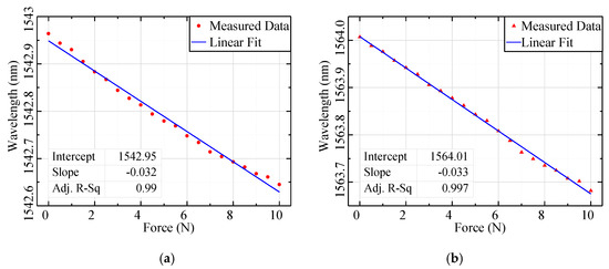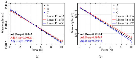 The applied axial force changed from 0 N to 10 N, and the measurement was repeated three times to obtain the accuracy, linearity, and repeatability for the load measurement. It can be seen from Figure 8 that with an increase of the load, the interference signal of the cavity moves in the shortwave direction. The test data show that the wavelength shift of the sensor exhibits a linear relationship with the axial force. Figure 8a,b represent the test results and fitting curves obtained from three measurements of sensor signal 1 and sensor signal 2, respectively. It can be seen from the results that the strain sensing characteristics of the sensor have good linearity. The measured linearity (adjusted r-squared—Adj. R-Sq) for sensor signal 1 was 0.99367, 0.9952, and 0.99506; and for sensor signal 2, the measured linearity was 0.99684, 0.99767, and 0.99143. The sensitivity for sensor signal 1 was 33.0 pm/N, 31.0 pm/N, and 34.5 pm/N; and for sensor signal 2, it was 33.2 pm/N, 32.0 pm/N, and 35.6 pm/N. Considering the strain transfer efficiency, the measurement sensitivity of the EFFP sensor for axial force is higher than that for the fiber Bragg grating sensor. The measurements results of the three different measurements are very similar, showing that the repeatability and accuracy of the sensor are high.