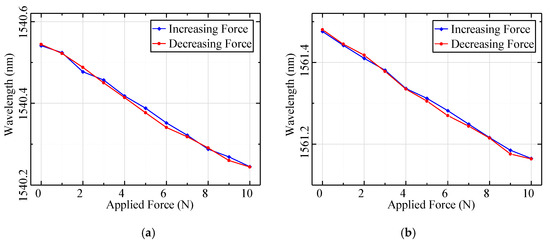 According to these outputs, the ‘loading’ and ‘unloading’ curves provide different values of the sensor output values versus the same value of the applied force. The loading/unloading hysteresis for the sensor was also characterized in an experiment by measuring the wavelength corresponding to cyclic force change, and the result is shown in Figure 9. The blue line measured from low to high force represents the increasing process, and the red line measured in the opposite direction represents the decreasing process. The major contribution of hysteresis may come from the welding layer used to bond the sensor and structure. The maximum hysteresis error of sensor single 1 and sensor single 2 was 4.00% and 3.67%, respectively, which was observed under 2 N and 6 N. It should be noted that since the tested structure has a microdynamic response for mechanical swing owing to the small size, the real hysteresis error is relatively lower. Thus, these results indicate favorable reliability of the sensor [34], and that the hysteresis of the sensor is lower.