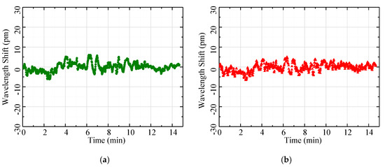 The constant load of 5 N was loaded onto the structural member to test the stability. The central wavelength data of the sensor was recorded per 1 s, and the total data collection time was 15 min. The test results are shown in Figure 11. For sensor signal 1, the maximum wavelength drift was 12.21 pm, while for signal 2, it was 11.79 pm. The measurement drift is believed to be due to the following reasons. One reason is due to the sensor itself, which generates a systematic shift. The other reason is that as the tested structure has light weight, the variation caused by swing needs to be considered. These results indicate that the stability of the sensor is good.