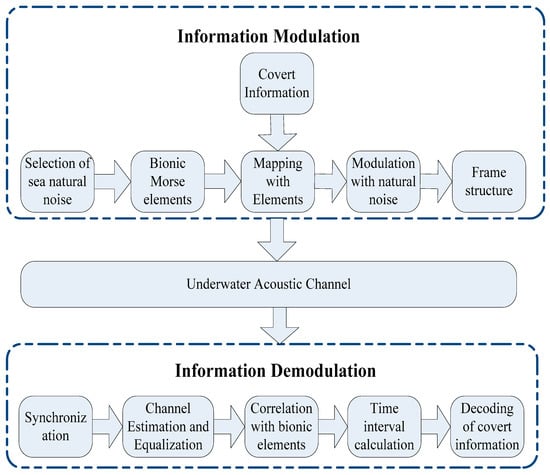 The process of bionic Morse coding mimicking sea natural noise is briefly discussed in this section. It is slightly different from the process of underwater acoustic communication as it requires the communication signal to be perfectly imperceptible to sea natural noise. The structure is shown in Figure 2. We will concisely elaborate on the process step by step with the practical example of mimicking a humpback whale song.