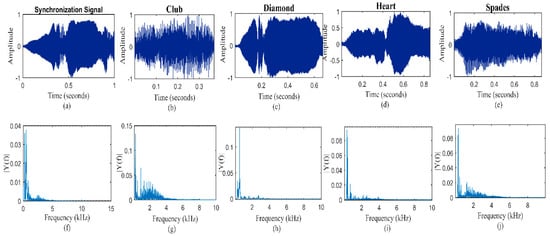 (a) Synchronization signal, (b–e) bionic Morse elements as club, diamond, heart and spades in time domain, and (f) shows single sided Fourier transform of synchronization signal and (g–j) bionic Morse elements respectively.