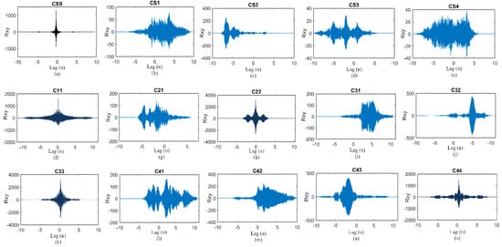 Figure 4a–e shows the auto and cross correlation of a synchronization signal with bionic Morse elements. It can clearly witness the high correlation peak only in (a) which dictates that the synchronization signal is only identical to its signal and different from other bionic Morse elements. Similarly Figure 4f–o shows the auto and cross correlation between bionic Morse elements. We can notice that C11, C22, C33, and C44 have high correlation peaks which are not uniform in other correlation outputs. This proves that the waveforms of bionic Morse elements and synchronization signal are dis similar and they could be easily distinguishable at the receiver. The waveform can be decoded at the receiver through correlation technique. The demodulation process is briefly elaborated in Section 4.2.
