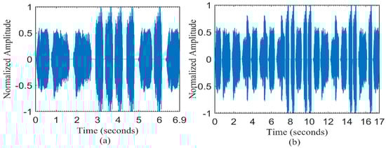 To verify the variable patterns of a humpback whale song, several samples of humpback whale songs are compared. Figure 13 shows the spectrum characteristics of some phrases of different humpback whale songs depicted from the ocean acoustic library []. It is evident form the figure that humpback whale songs have diverse characteristics with various patterns but the bandwidth of the waveform lies within 8 kHz. The main energy in concentrated within 4 kHz. Thus we can conclude there is no fix pattern of humpback whale songs.