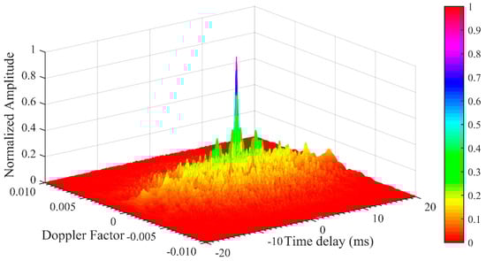 In this research we have used a humpback whale song for bionic communication. The synchronization signal is also composed of one segment of a humpback whale song. The time and transform characteristics of the synchronization waveform are shown in Figure 3a,f respectively. It is the broadband signal modulated with a wide range of frequencies from 0.1 to 3.5 kHz. The first segment of Figure 1b is used as a synchronization signal in this research. We can clearly notice from Figure 1 that all the segments are broadband in nature modulated with multiple frequencies. Figure 7 shows that the characteristics of humpback whale song with respect to the Doppler factor and auto correlation. The Doppler factor is calculated by change in frequency with respect to carrier frequency. Therefore it can be equated as