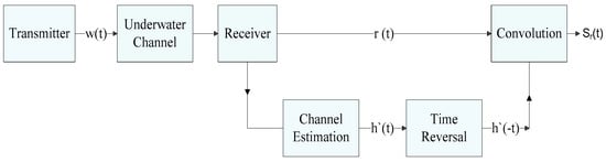 The objective of the channel estimation and equalization is to enhance the performance of the system. It reduces the bit error rate by evaluating the effect of multipath, time and frequency variance in an underwater acoustic channel. The channel equalization adds the distributed energy of multipath arrivals projected by the channel estimation technique which reduce errors. We equalize the errors using a virtual time reversal method (VTRM). The framework of the VTRM is shown in Figure 9. The estimated channel is inverted in time domain and convolved with . The final virtual signal received is acquired by convolving the received signal by the inverted estimated channel. Therefore: