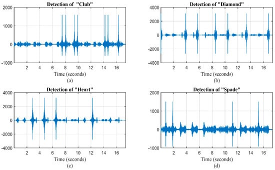 Detection of bionic Morse elements (a) club, (b) diamond, (c) heart and (d) spade from a mimicked message “COMMUNICATION”.