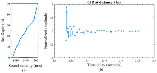 The performance of the multipath channel is verified by the simulation experiment using a Bellhop ray tracing algorithm in MATLAB. Real data of a sound speed profile is extracted from the World Ocean Atlas [] which is shown in Figure 14a. The channel impulse response based on the sound velocities is graphed in Figure 14b. The ideal surface and bottom are selected in this simulation which has a total reflection. Long distance covert communication has been performed at a five km distance. The transmitter and receiver depth are selected at 20 m and 25 m respectively. The depth of the sea is 60 m. The beam angle is acoustic rays is 30 degrees.