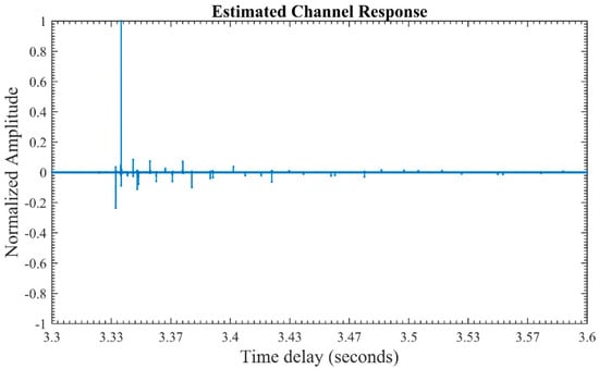 To overcome the effects of multipath arrivals and reduce BER, the MP estimation algorithm and VTRM technique are used for channel estimation and equalization, respectively. The estimated channel is shown in Figure 15. From the figure, it can be seen that there is one direct path with a high energy coefficient and others are indirect paths with a lower amplitude and a small time delay. These are multipath arrivals which have been created due to the echoes from the surface and bottom of the sea. The high energy components were accumulated, while the low energy delayed arrivals were ignored for the sake of simplicity. The errors were equalized using the VTRM equalization technique discussed in Section 4.2.