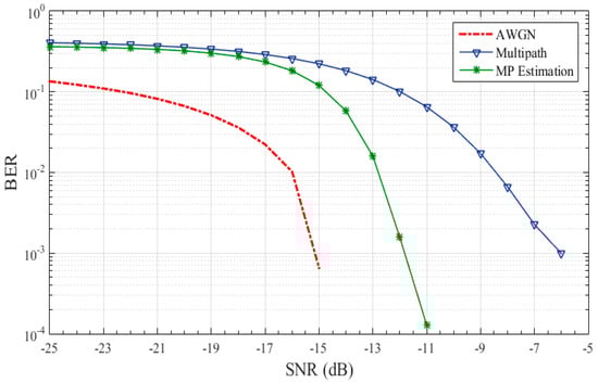 Figure 16 illustrates the BER curve of the proposed bionic method for covert information. First the performance of the AWGN channel is observed. The red dotted line BER curve in Figure 16 depicts the performance of the proposed method in the AWGN channel. It can be evidently seen that it is not much affected by AWGN and gives zero BER with SNR greater than 15 dB. The blue line is the BER with simulated channel whose channel impulse response is shown in Figure 14b. It clearly depicts that 10−3 BER is achieved at SNR −7 dB. The green curve shows the BER achieved after estimating the channel by MP algorithm. It further decrease the errors drastically from −14 dB. Zero BER is achieved at SNR greater than −11 dB. The resultsprovesthat the proposed method is perfect for underwater commination due to extremely low BER. Further it gives perfect covert LPR constraint covert communication. The proposed method is feasible for perfect covert operation at extremely low BER.