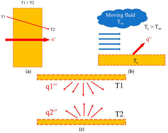 Heat transfer. (a) Heat conduction. (b) Heat convection. (c) Heat radiation.