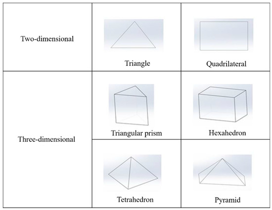 Meshing is an important part of numerical simulation. This stage is related to the accuracy and operation time of the analysis results. However, before meshing, the Design Modeler module in ANSYS Workbench is used to perform Boolean operations on each area of the geometric model to avoid excessive quality or interference of the mesh between the models, resulting in excessive errors or even failures. In ANSYS Mesh, the number of structured meshes is defined as the same number of adjacent meshes for all mesh nodes in the region. The grid is usually a hexahedron or a quadrilateral. Their advantage is that the meshing speed is faster and the quality is relatively good, which also makes the data structure simpler and faster, but it is more difficult to generate mesh when dividing the complex structure. Therefore, when the complex model is meshed, it will be divided by tetrahedron and triangle. The advantage is that the division can be easily generated on any model, but the convergence and accuracy are slightly inferior to the hexahedron and quadrilateral mesh. Figure 3 shows the different types of mesh.