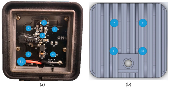 Position of thermoelectric coupling measurement points. (a) LED thermocouple measurement points (front). (b) LED thermocouple measurement points (back).