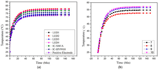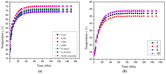The parameters for the design of LED lights include luminous flux, chip temperature, input power and cooling mechanism, etc. An excessively high operating temperature will decrease the performance of LEDs. Generally, the higher the luminous flux is, the higher the operational temperature is. Precise measurements are thus very important for the verification of LED lights’ performance. It was pointed out that the factors such as heat flux intensity, interference by heat flux, forward voltage, must be carefully handled for an accurate measurement of LED lights [1]. In 2017, Chernyakov analyzed the temperature distribution for different arrays of AlInGaN LEDs. With the physical model developed for the LED array, Chernyakov built an expression for the thermal resistance. Using optical microscopy and a thermographic camera, the relationship between thermal resistance and current was established by Chernyakov, and the actual temperature distribution was then obtained for the LED array [2]. Studies showed that the current density on the surface of the chip is critical for the performance of LEDs. According to a study by Cheng Qian, when the current density is controlled to be uniform, an extra 8% of luminous flux can be achieved [3]. As the size of the chips is gradually miniaturized, the heat density of the LEDs is accordingly increased. Thus, it is important for the trend of miniaturization for LEDs that the reliability and service life can be accurately predicted by the corresponding measurement and/or analysis. The topics of studies about LED lights include LED long-term reliability analysis, real-time temperature monitoring, measurement of their mechanical properties at high temperatures, and performance estimation of LEDs through TIMs temperature monitoring [4,5]. Nowadays, the heat dissipation methods for the electronic components and LEDs in the industry are divided into two major parts: active heat dissipation and passive heat dissipation. Excellent heat dissipation means the high-quality performance of LEDs. However, the operation for measuring the performance of LEDs is complex and very time consuming. Instead of practical measurements, many studies have approached the study of LEDs by simulation. For example, Kudsieh used ANSYS-13TMFFM to investigate chip-on-plate LEDs for solid state lighting and backlight displays. The results showed that a rectangular substrate has an effective thermal diffusion and uniform temperature distribution as compared to the circular and irregular substrates [6].