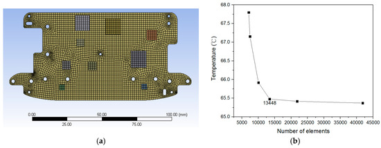 Before starting the simulation, a mesh convergence analysis must be performed to justify the particular mesh used for the simulation. The mesh and convergence analysis result of the single chip model are shown in Figure 7, although the maximum temperature has converged at number of elements of 1580, for more accurate results, the mesh of 15751 elements is used in the simulation. The mesh and convergence analysis result of the PCBA model are shown in Figure 8, when the number of elements is 13,448, the maximum temperature results reach convergence, therefore the mesh of 13,448 elements is used in the simulation.
