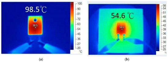 Temperature field of the heating single chip. (a) Original single chip temperature. (b) Pasted graphene composite TIM (MSA13050).