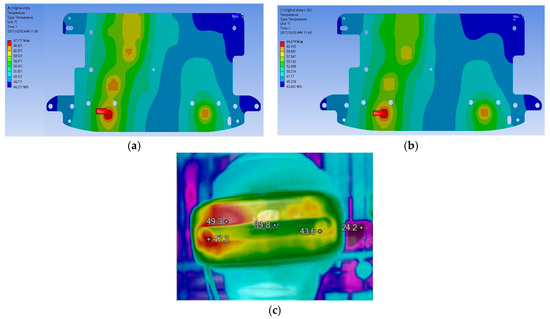 The analyzed temperature field of the VR device board is shown in Figure 12a, showing that the 10 highest temperatures in the chip are on the backlight driver chip. The length and width of this chip are only 3 × 3 × 1 mm, but the power consumption is as high as 0.7 W, and the simulated temperature is 67.17. It can also be seen from the results that the thermal diffusion range and temperature on the left side of the MCPCB are both higher, because there are more high-power chips on the left side. After shooting with a thermal imager (Figure 12c), the high temperature area shows that the left temperature field is indeed higher than other regions. The highest temperature is at the upper left and the simulation results are different, because the simulation environment is assuming that the simulation is performed in an open space and there is no problem of heat accumulation in the outer casing, the heat generated by the heat source can be dissipated by natural convection. However, the result of the thermal imager is shown in Figure 12c. The metal core printed circuit board assembly (MCPCBA) is completely enclosed in the outer casing, so the gas in the closed environment can almost ignore the natural convection. In addition, the highest temperature and the second highest temperature position have a USB device for power supply and data transmission at the same time, so the temperature here is the highest. The temperature field distribution of the VR device can be reasonably predicted through simulation and experiment.