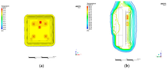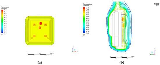 Figure 13a shows the analysis results of input 48 V, 0.15 A. According to the experimental results, the LED input is 5.5W evenly distributed to four LEDs. One LED body heat source is set to 1.375 W, and the IC is 1.14 W and 0.64 W respectively. After simulation, the maximum temperature of 77.2 °C is located at the bottom of the power control IC-SM1A chip. Figure 13b shows the isotherm diagram of 48 V, 0.15 A. It can be found that the heat transfer ability of the gas in the internal space is limited. The waste heat generated by the LED is transmitted to the heat dissipation fins and dissipated with the flow channel. Figure 14 shows the analysis result of input 60 V, 0.15A. The highest temperature is just below the power control chip. However, when the input wattage is 9 W, the temperature field generated by the heating chip is connected to the high temperature region of the upper LED, so the circuit components located here need special attention.