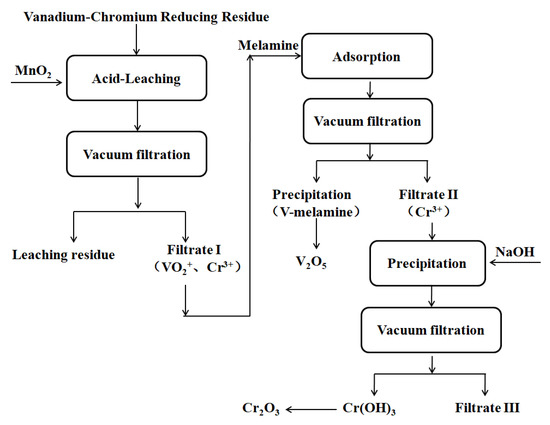 Vanadium(V) and chromium (Cr) are key resources that have been widely used during the manufacturing of petrochemicals, catalysts, ferrous and non-ferrous alloys, and stainless steel [1,2,3,4]. Due to the similar chemical and physical properties, vanadium and chromium commonly co-exist in minerals. Industrial vanadium is usually extracted from vanadium titanomagnetite ore and stone coal, during which a large amount of wastewater containing V(V) and Cr(VI) is produced. To satisfy the discharge standard, Na2SO3 or iron scurf is added to reduce and precipitate Cr(III), V(IV), and V(III), with the solid named as vanadium–chromium reducing residue (VCRR). China produces over 500 thousand tons of VCRR every year, causing significant environmental pollution, therefore, proper and efficient VCRR management technologies are urgently required.